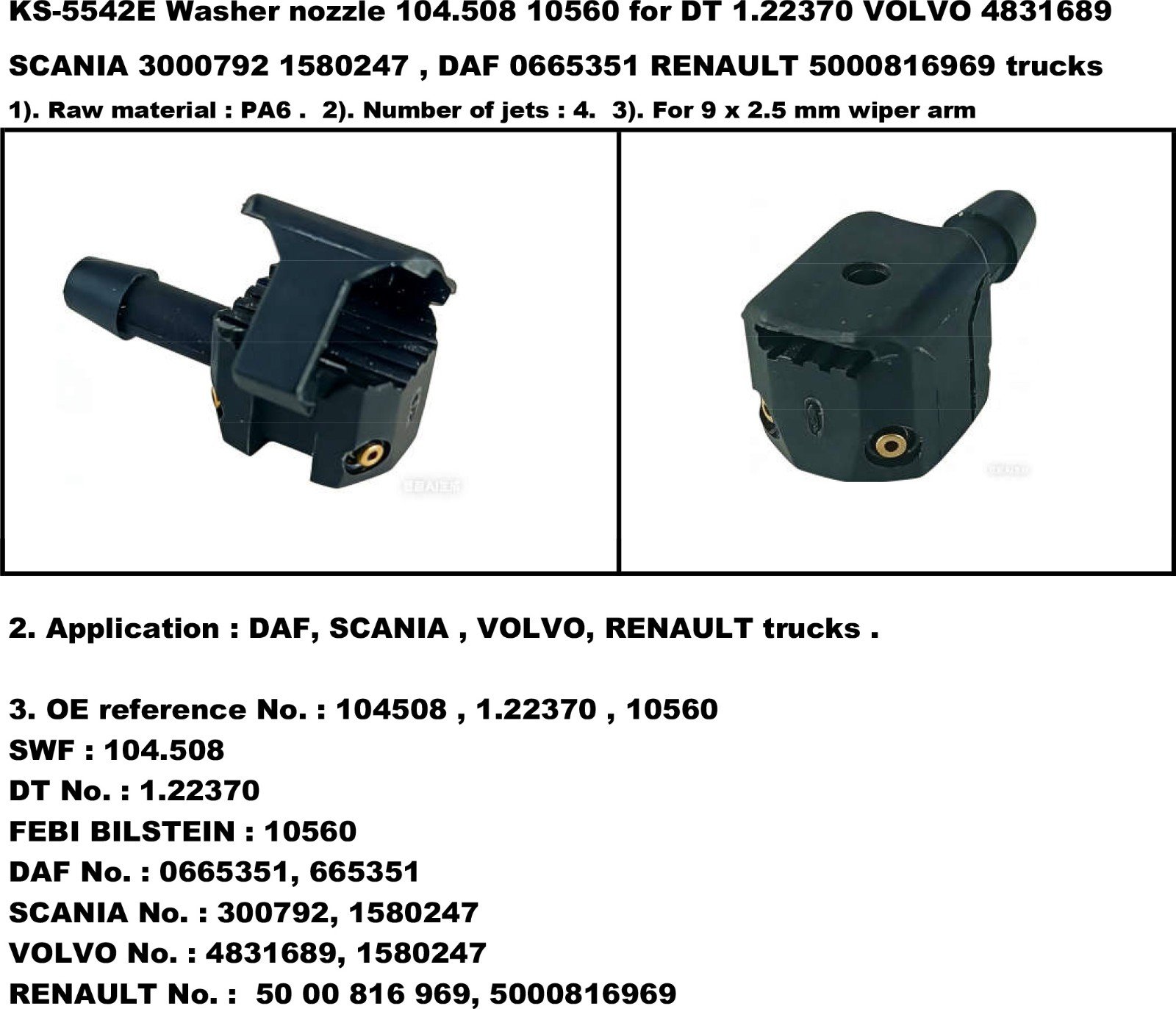 KS-5542E SWF 104.508 10560 DT 1.22370 VOLVO 4831689 SCANIA 3000792 1580247 , DAF 0665351 RENAULT 5000816969 trucks washer nozzle