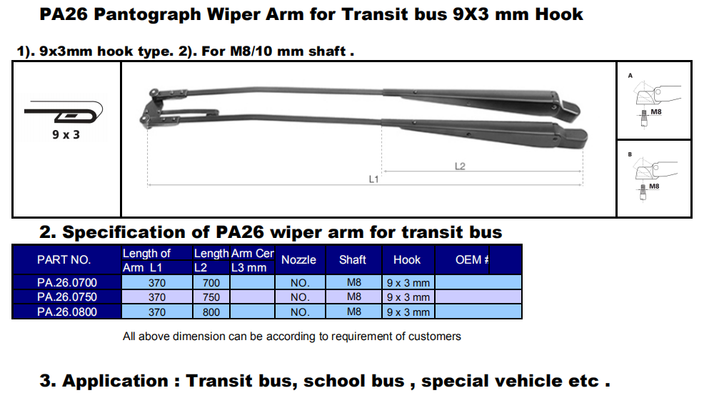 3. Length of wiper arm : 700 mm ; 750 mm ; 800 mm.