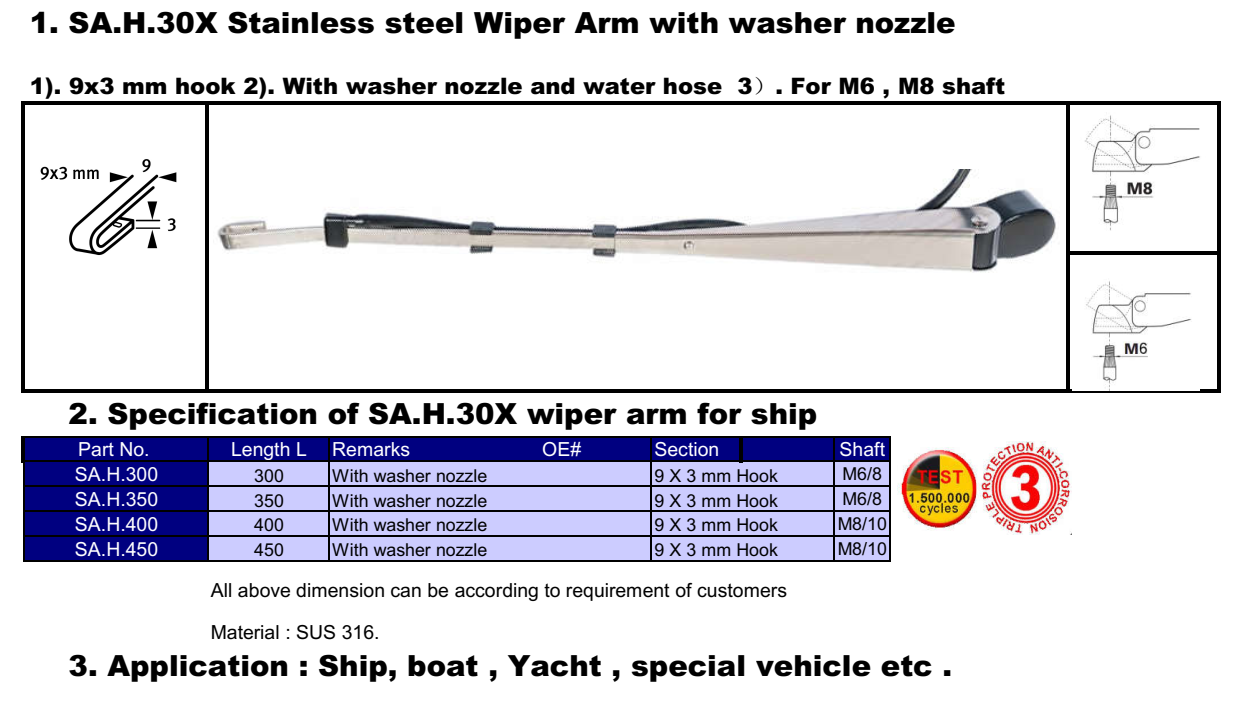SA.H.30X Stainless steel Wiper Arm with washer nozzle